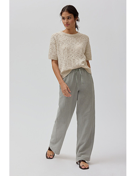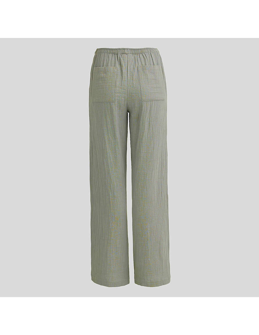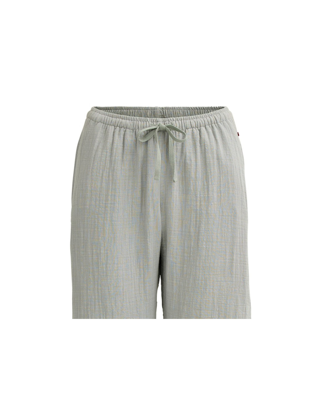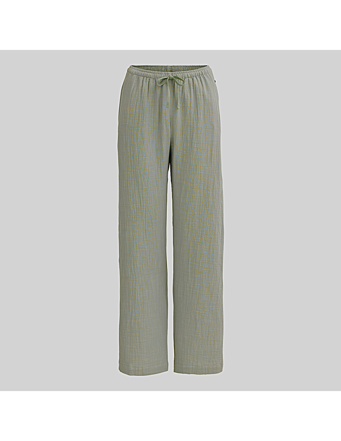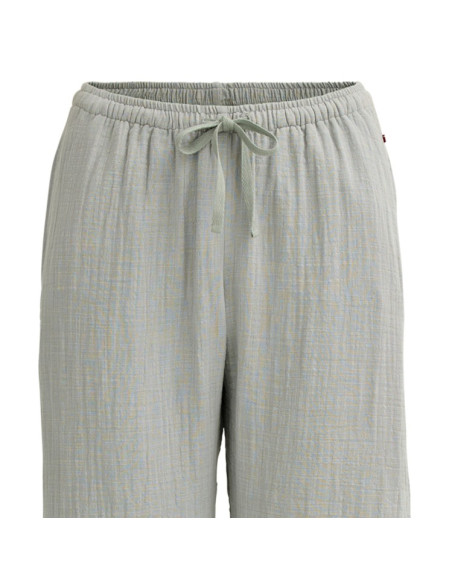 Pantalone donna di People Wear Organic in 100% mussola di cotone biologico, modello dalla vestibilità ampia con elastico in vita e coulisse regolabile, fresco e comodo per la stagione primavera /estate, colore verde salvia