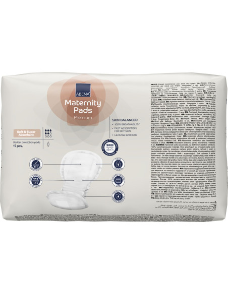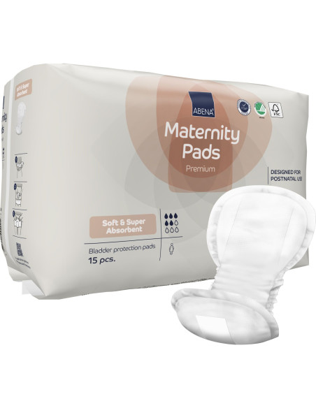 Assorbenti Post Parto Abena Maternity Pads Premium, specifici per il periodo post-partum e per incontinenza occasionale da lieve a moderata. Di forma anatomica e con striscia adesiva, sono sostenibili e 100% traspiranti assicurano pelle sana e un comfort ottimale. Confezione da 15 pezzi