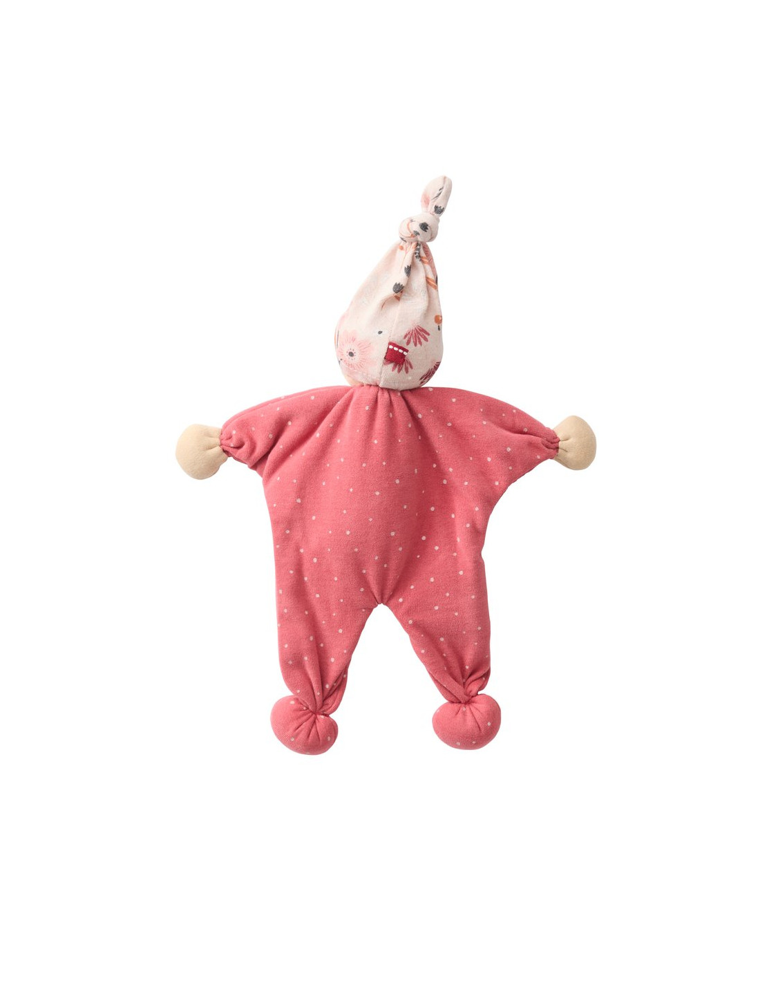 Cappellino con nodino, fissato alla testa mediante cucitura, realizzato in jersey di cotone rosa chiaro stampato; viso e manine in tricot di cotone colore pelle, corpo in tessuto jersey rosso corallo con puntini rosa. I tratti degli occhi e della bocca ricamati a mano rendono ogni pezzo unico. Imbottitura in cotone biologico.