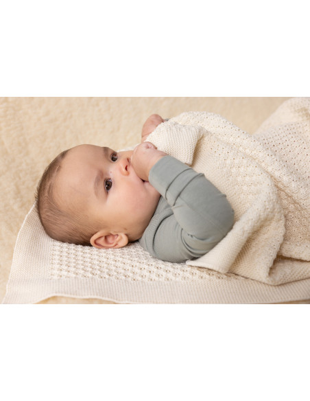 La copertina, caratterizzata dalla bellissima lavorazione a nido d'ape, risulta particolarmente morbida e termoregolante ed è ideale per avvolgere il neonato oltre che come copertina adatta al lettino del bimbo piccolo.