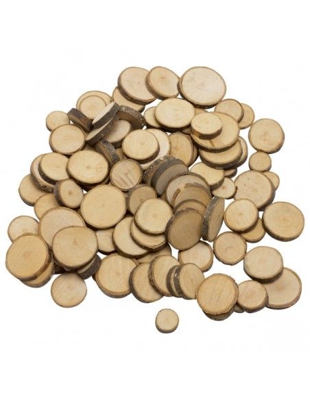 Il set contiene circa 100 dischetti ricavati da piccoli rami, il diametro ha misure variabili comprese tra 1 e 3 cm circa, lo spessore è di 0,3 - 0,4 cm circa.