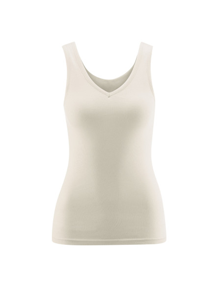 Canottiera donna "Janine" in cotone biologico di Living Crafts, con scollo a V e spalla larga, adatta a pelli sensibili e con tendenza allergica