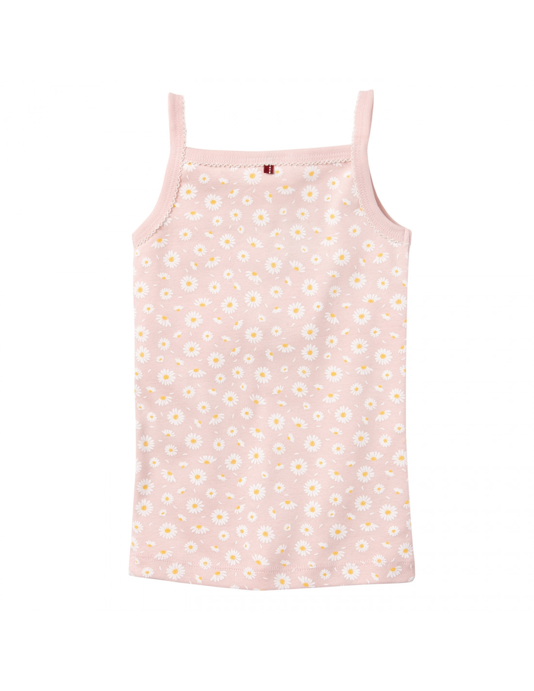 La canottiera è rifinita lungo le spalline, nello scollo e nel giro manica da un bordino dentellato di colore bianco contrastante.