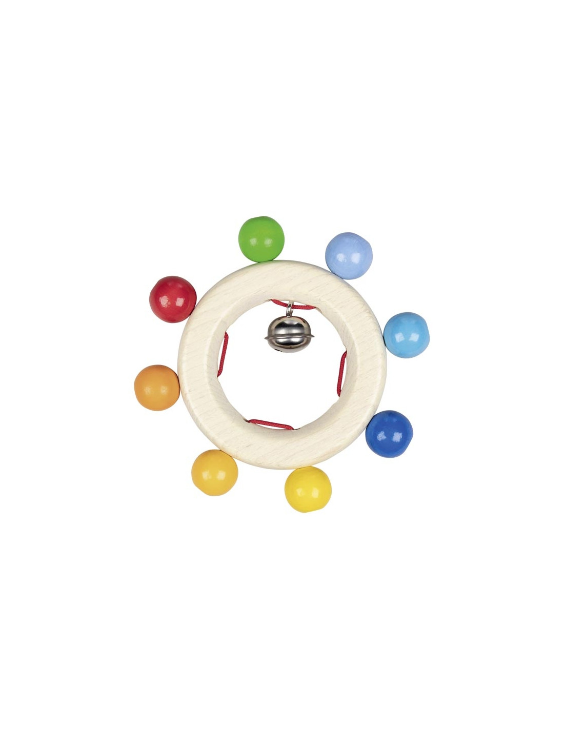 Anello baby da manipolare in legno di Goki, realizzato con perle in legno dai colori dell'arcobaleno e campanellino, stimola le prime esperienze sensoriali del neonato