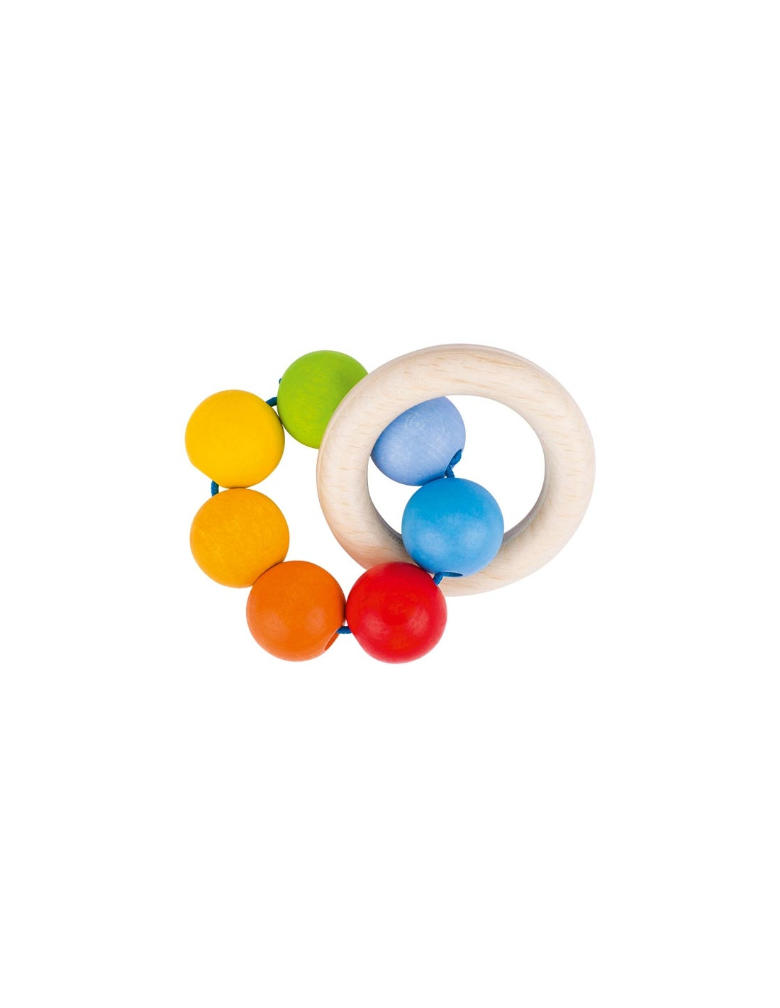 Dalla linea Goki Baby, anello tattile con perle Arcobaleno e anello in legno naturale, ideale per le prime esperienze tattili e sensoriali del bambino.