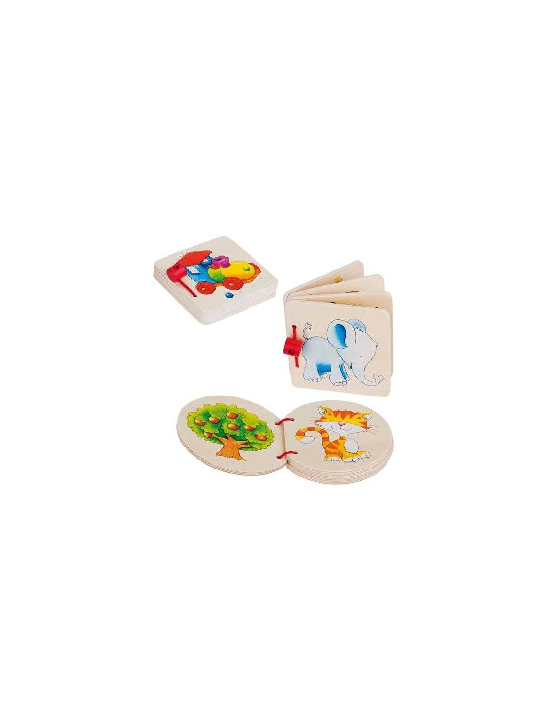 Il set prevede due libri di forma quadrata e un libro rotondo con motivi Elefante, Casa, Locomotiva.