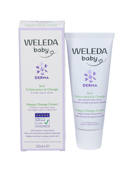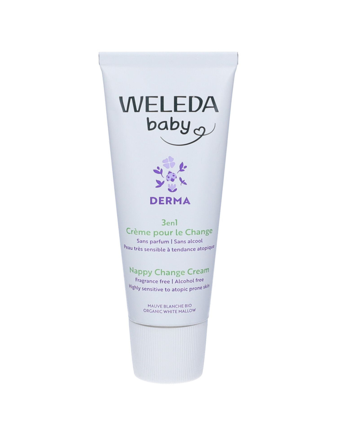 Baby Derma 3in1 Crema protettiva alla Malva Bianca di Weleda, lenisce la pelle delicata nella zona del pannolino e protegge efficacemente dall'eritema da pannolino riducendo il rossore, tubo da 50ml