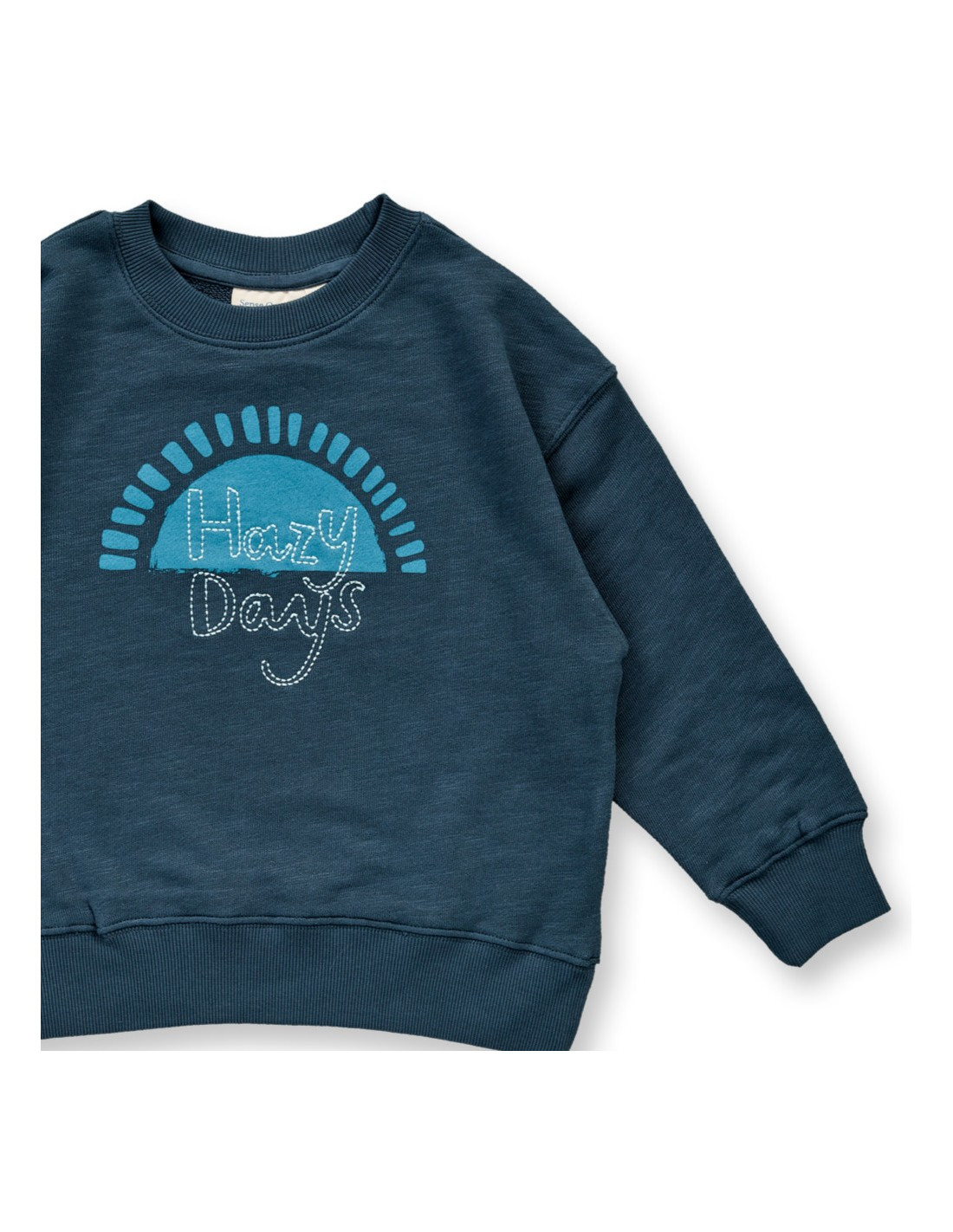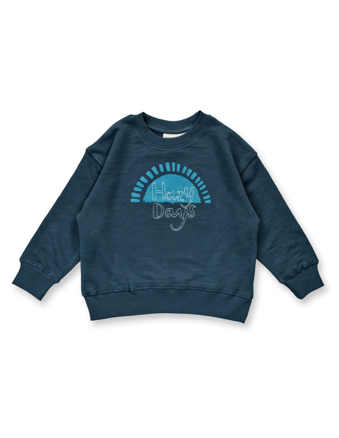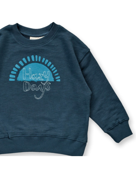 Felpa bambino in cotone biologico di Sense Organics con motivo stampato "Hazy Days", colore verde petrolio, lavorazione interna effetto spugna per una morbida sensazione sulla pelle