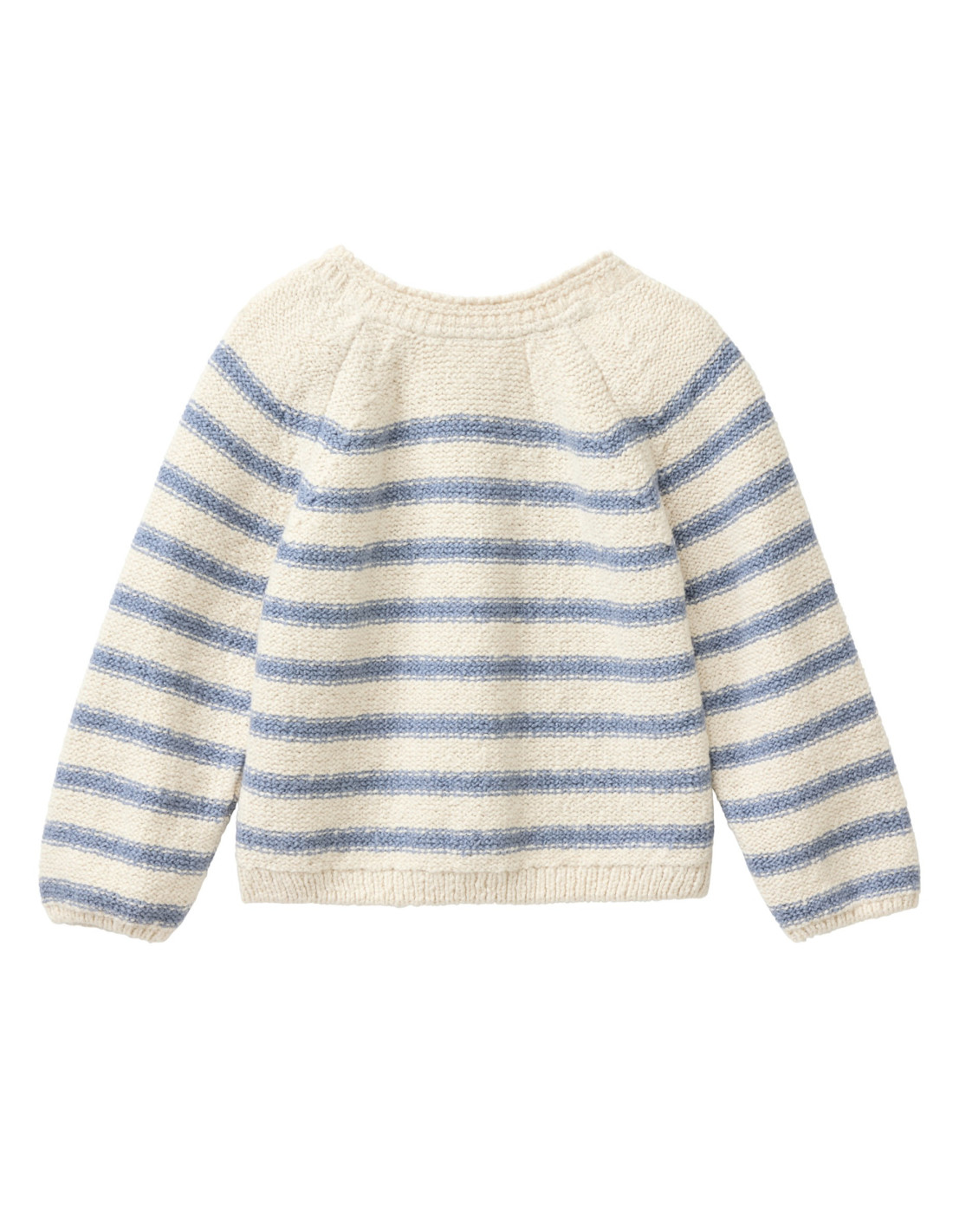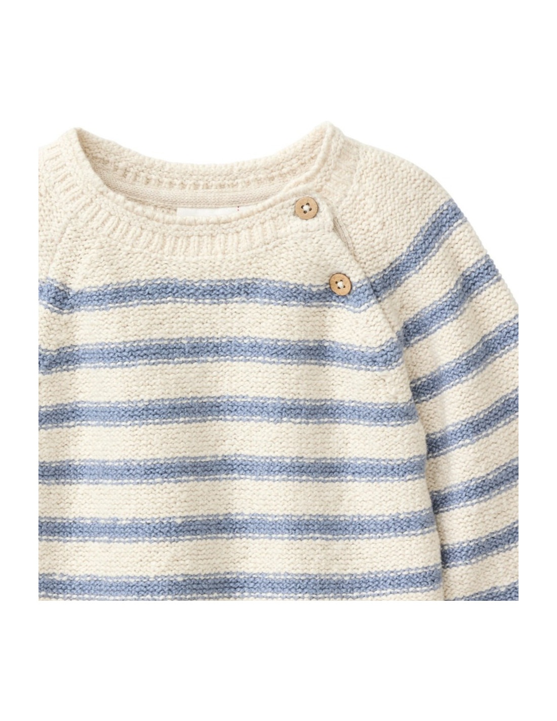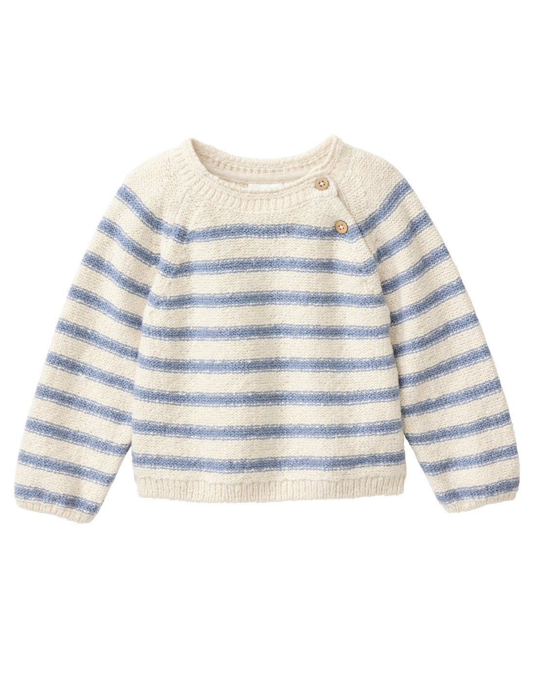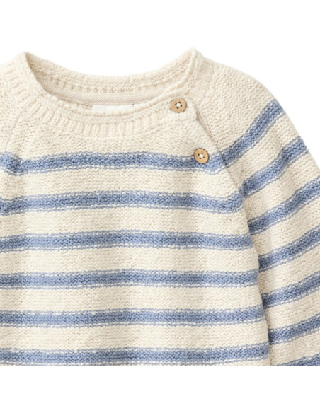 Pullover baby di People Wear Organic in morbidissimo cotone biologico lavorato a maglia rasata rovescia, con bottoncini in legno di cocco lungo il taglio della manica raglan, colore beige chiaro con motivo a righe azzurro-grgio