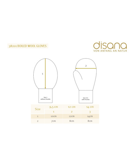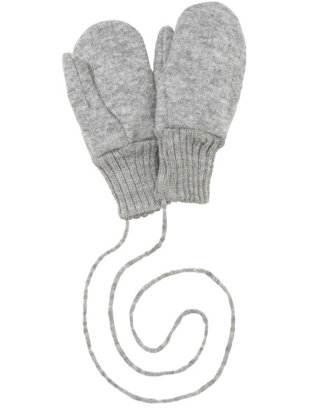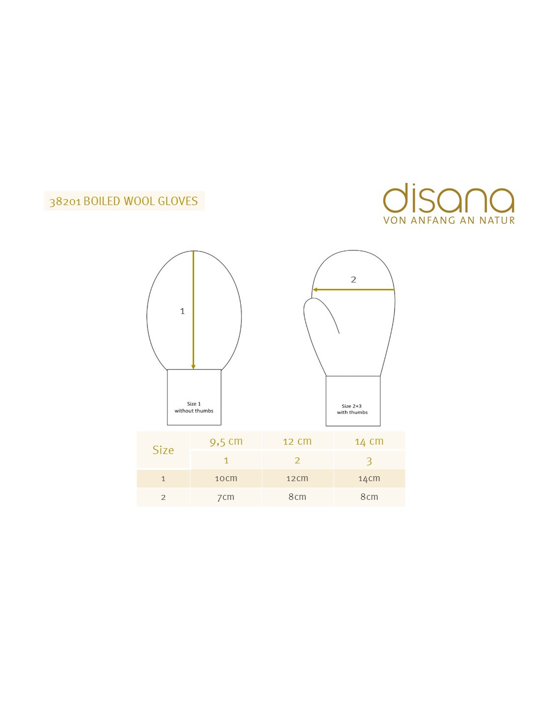 Morbidi guantini a manopola di Disana con pollice confezionati in 100% lana cotta, molto caldi ed idrorepellenti, uniti tra loro da un lungo cordoncino in lana.