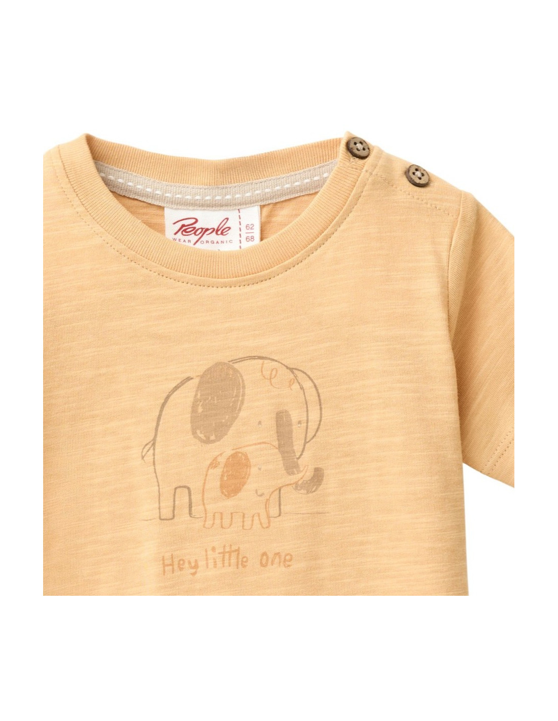 T-Shirt baby in morbido cotone bio di People Wear Organic, modello con bottoncini in legno sulla spalla, colore sabbia con tenero motivo stampato "Avventura"
