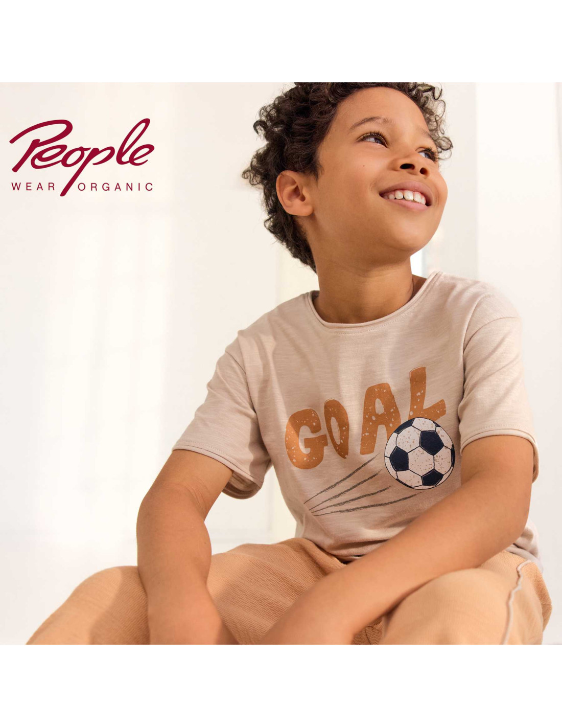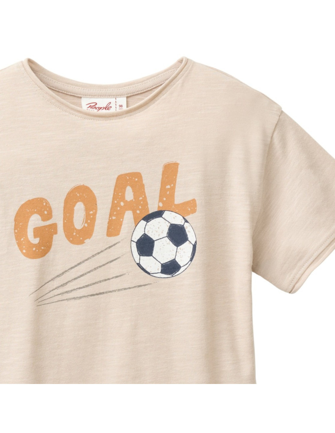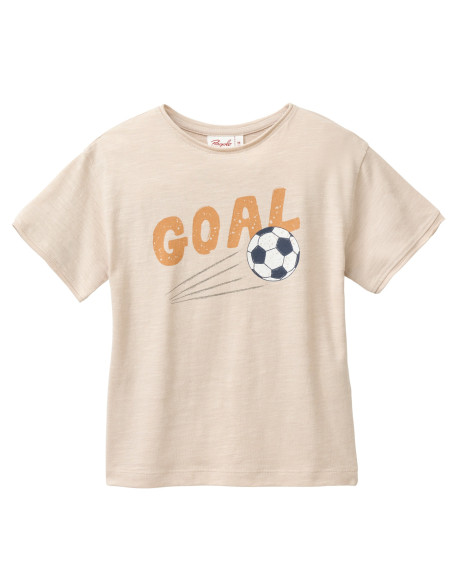 T-Shirt bambino in morbido cotone bio fiammato di People Wear Organic, leggera e fresca per l'estate, colore sabbia con motivo stampato "Goal"