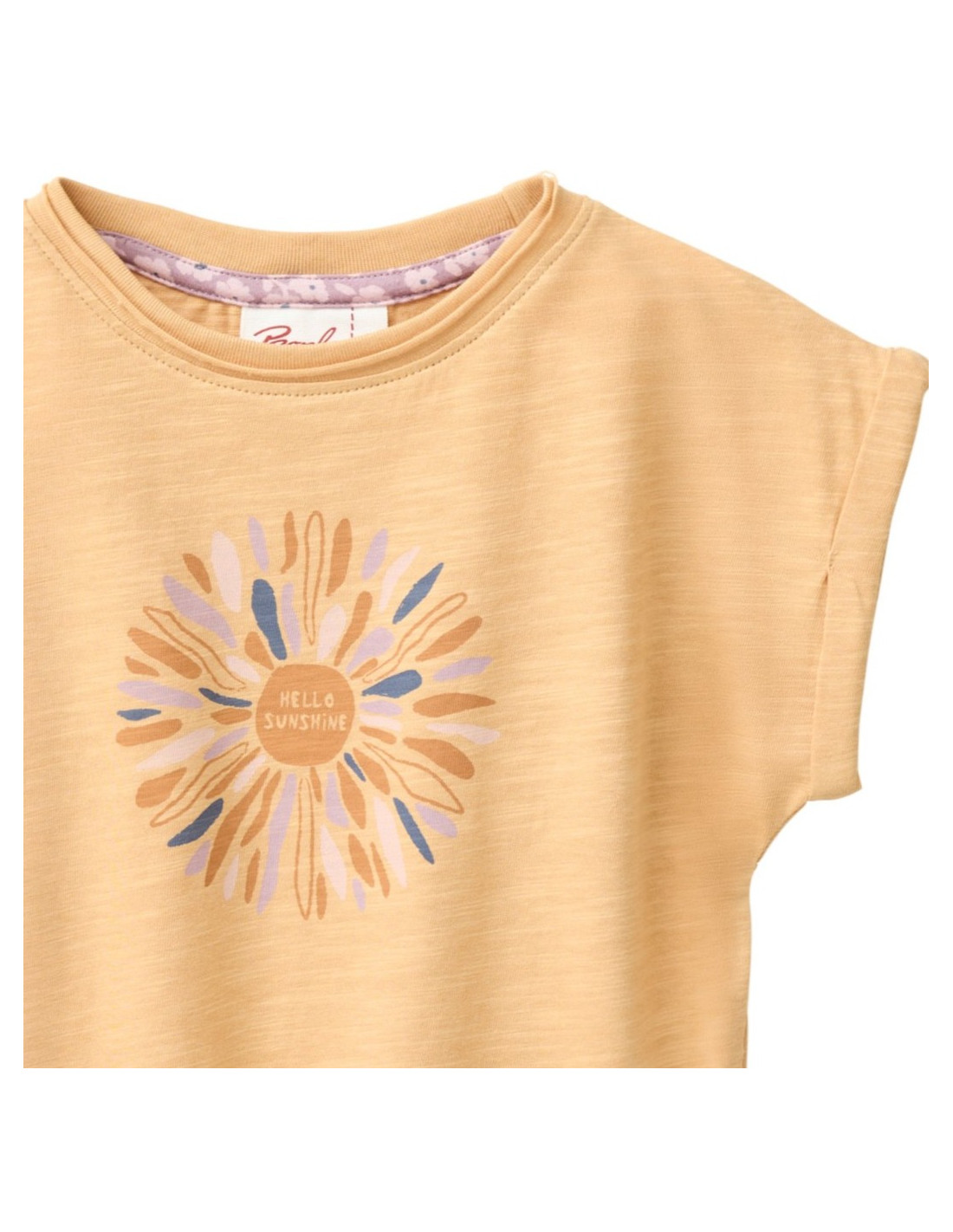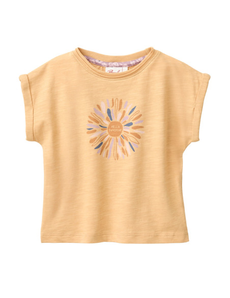 Il modello è proposto nel colore giallo miele ed è arricchito dalla stampa “Hello Sunshine”, che dona alla maglietta un vivace tocco di colore.