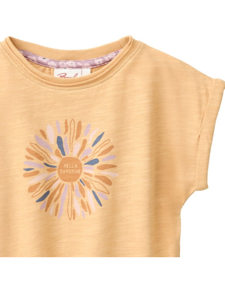 T-Shirt bambina in morbido cotone bio fiammato di People Wear Organic, leggera e fresca per l'estate, colore giallo miele con motivo stampato "Hello Sunshine"