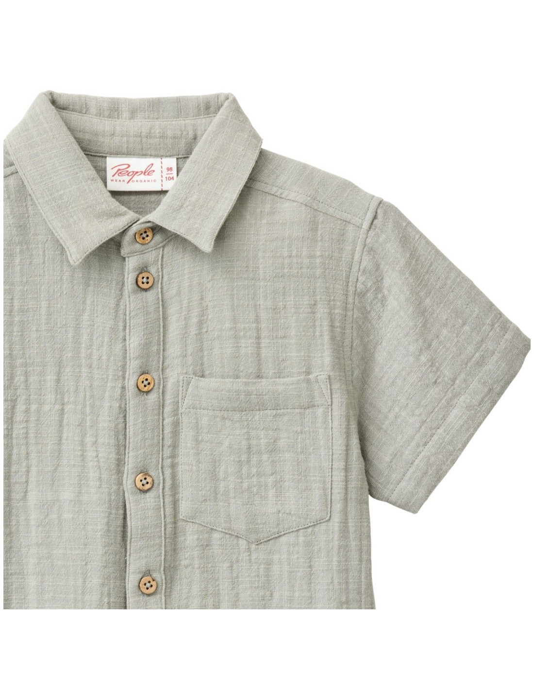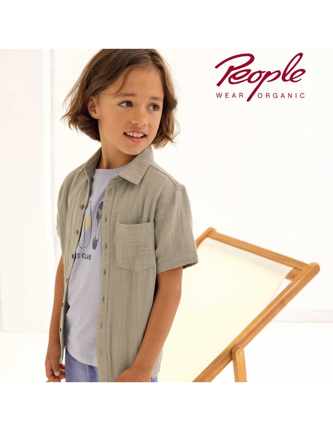 Camicia bambino a maniche corte firmata People Wear Organic, realizzata in 100% mussola di cotone biologico certificato GOTS (Global Organic Textile Standard). Un capo fresco, leggero e delicato, ideale per la pelle sensibile dei bambini.