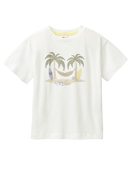 T-Shirt bambino in morbido cotone bio fiammato di People Wear Organic, leggera e fresca per l'estate, colore bianco con motivo stampato "Fun Island"