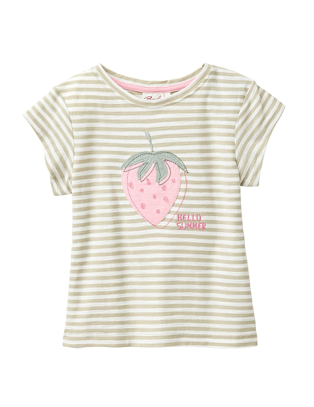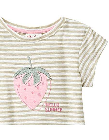 Il modello è proposto nel colore bianco a righe verde salvia ed è arricchito dall'applicazione cucita con motivo “Hello Summer", che dona alla maglietta un tocco fresco e naturale.