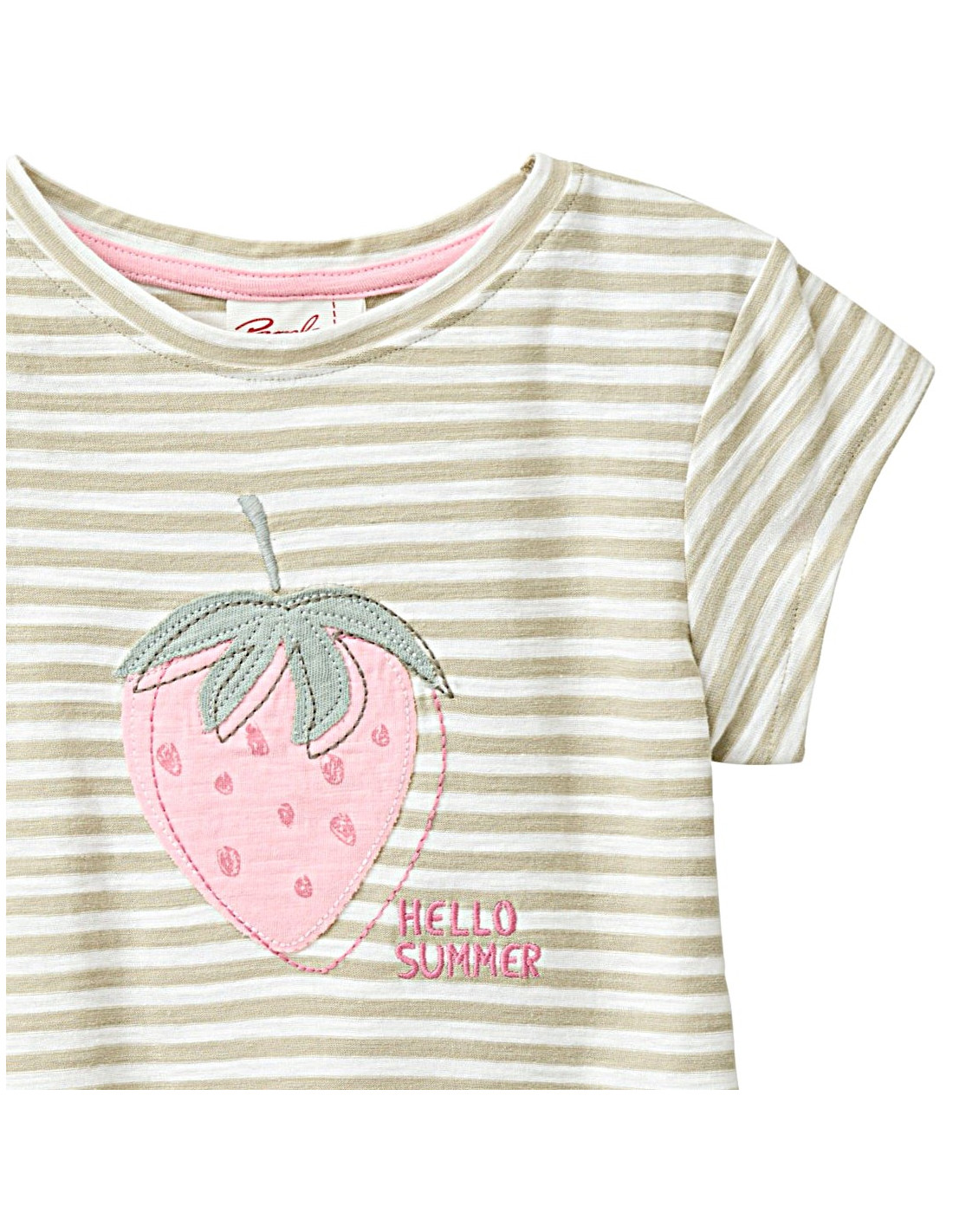 T-Shirt bambina in morbido cotone bio fiammato di People Wear Organic, leggera e fresca per l'estate, colore bianco a righe verde salvia con applicazione motivo "Hello Summer