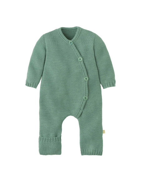 Overall neonato di Disana lavorato a maglia in 100% lana Merino biologica, col. giada, con piedini risvoltabili, dona calore e comfort al neonato