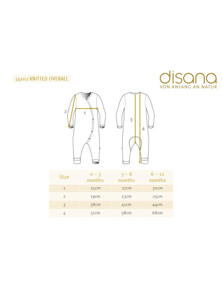 Overall Baby di Disana realizzato in 100% finissima pura lana vergine Merino da allevamento biologico, qualità biologica del filato certificata dal GOTS (Global Organic Textile Standard).